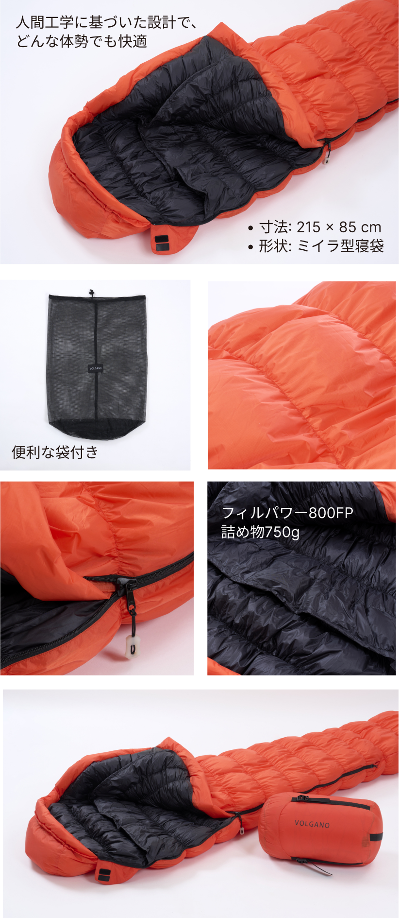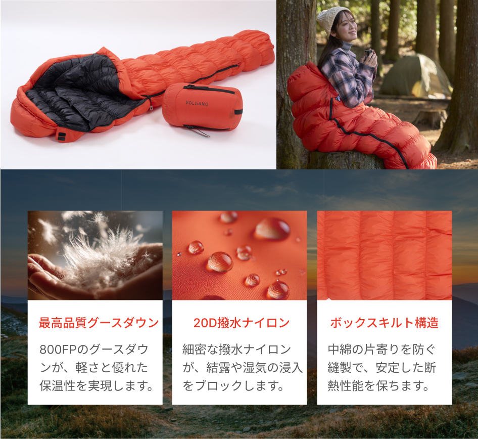 800FPの高品質グースダウンと20Dの撥水ナイロンを採用しており、耐久性にも優れています。適切なお手入れと保管を行えば、長くお使いいただけます。