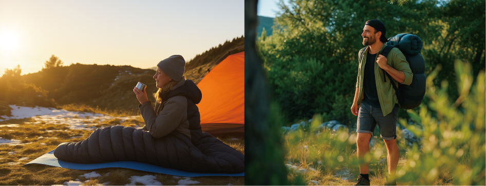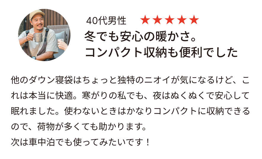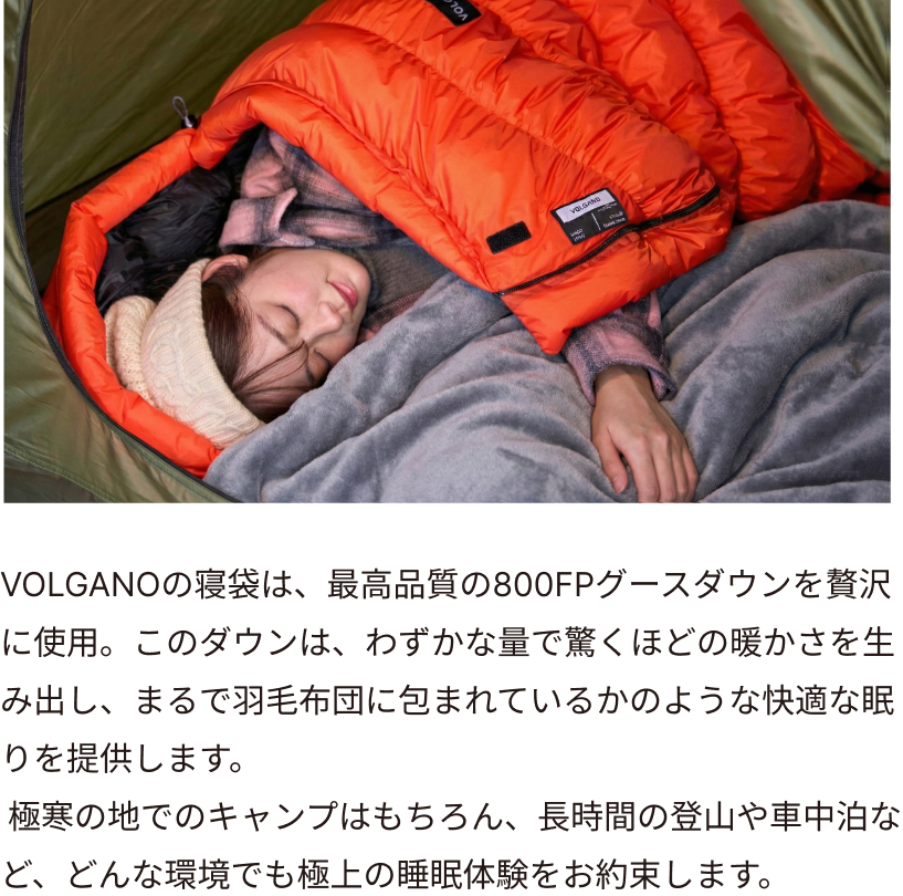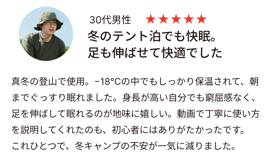 -10〜-20℃の寒冷地にも対応しています。極寒の山岳地や冬のキャンプでも、体温をしっかりと保持し、安心してお休みいただけます。
