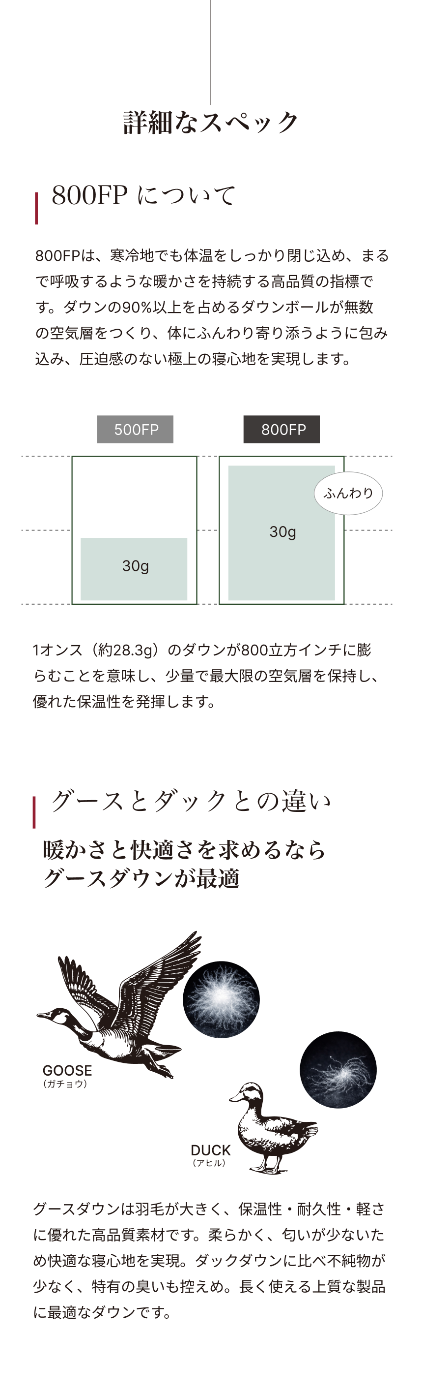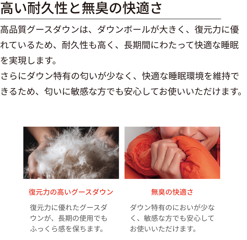グースダウンは羽毛が大きく、保温性・耐久性・柔らかさに優れ、匂いも少ない天然素材です。化学繊維よりも軽くてコンパクトに収納でき、快適な寝心地を実現します。